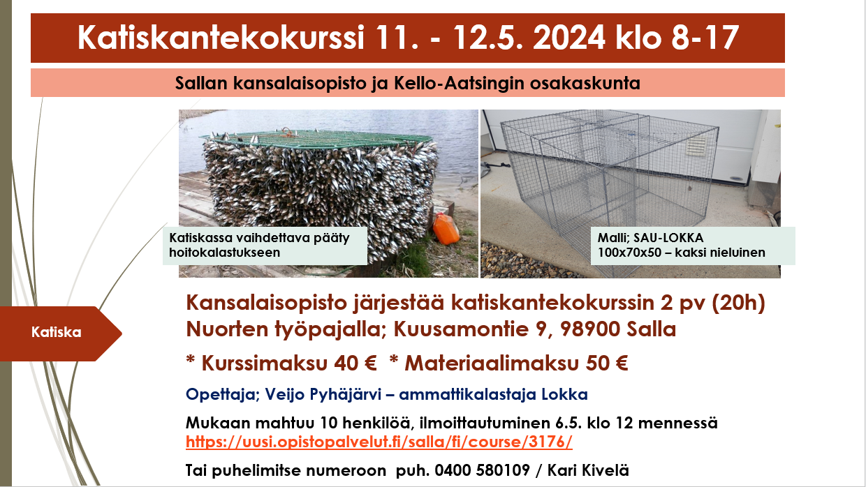 Vähäarvoisen kalan poistopyyntiä tehostetaan katiskapyynnillä (20 katiskaa) kesäkuun aikana. Katiskat valmistetaan Sallan kansalaisopiston kurssilla toukokuulla (2 pv, la-su), opettajana Lokan ammattikalastaja Pyhäjärvi Veijo. Kurssi on kaikille avoin, mukaan mahtuu 10 henkilöä, kurssimaksu 40 euroa ja materiaalimaksu 50 euroa. Kello-Aatsingin osakaskunta osallistuu kurssille, tavoitteena valmistaa kaksikymmentä (20) hoitopyyntikatiskaa. Osakaskunnan valmistamat katiskat toimivat, vuosittain, kesäkuulla yhteispyyntivälineinä hoitokalastuksessa ja sen jälkeen katiskat jaetaan loppuvuodeksi osakaskunnan kalastajille aktiivikäyttöön. Katiskassa on ”tuplapääty”, joista tiheämpisilmäinen päätyverkko voidaan poistaa, kun pyydetään isompaa kotitarvekalaa.