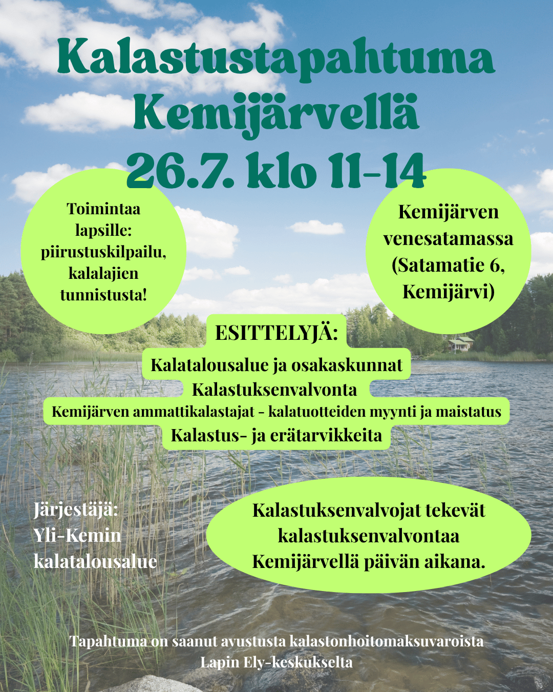 Yli-Kemin kalatalousalue järjestää kalastustapahtuman Kemijärvellä venesatamassa (Satamatie 6, Kemijärvi) lauantaina 26. heinäkuuta. Tapahtuma-aika on kello 11-14.