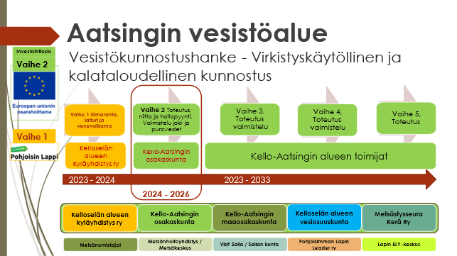 Kello-Aatsingin osakaskunta on toiminut hankkeen aktiivisena kokoonjuoksijana. Toiminnallisia, rahoituksellisia ja aikataulullisia haasteita on runsaasti, joten hankeajaksi määritettiin kymmenen vuotta, vuodet 2023–2033. Kokonaisuus on pilkottu osahankkeiksi ja osatavoitteiksi, joita viedään vuosittain määrätietoisesti läpi (Kaavio 1). Etuna on, osahankkeiden nopeampi kierto sekä tulosten näkyvyys, ja hankkeiden rahoitus ja sen hallinta. Osahankkeiden vetovastuuta voidaan myös vaihdella keskeisten toimijoiden kanssa, näin hankkeista ei muodostu liian raskaita samoille toimijoille. Kysymyshän on vapaa-ajalla tehtävästä talkootyöstä yhteiseksi hyväksi.